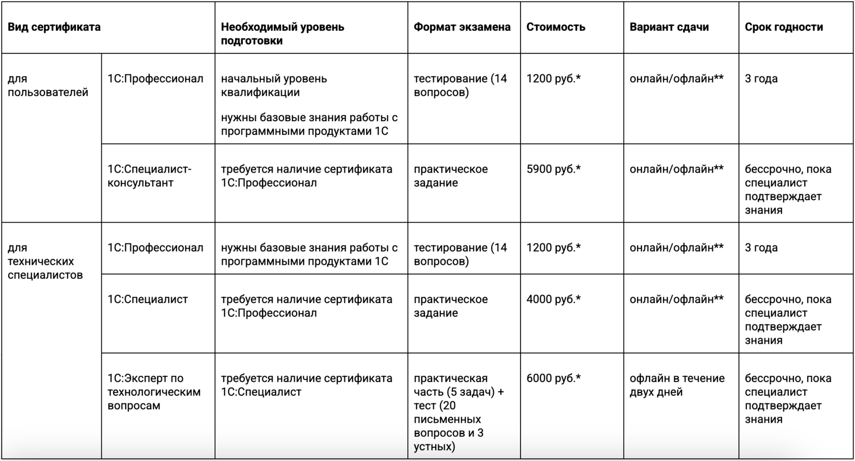 При этом допуск к экзамену «1С:Специалист» дается только при наличии сертификата «Профессионал», а для «1С:Эксперт» — нужны сертификаты «Профессионал по технологическим вопросам» и «Специалист».