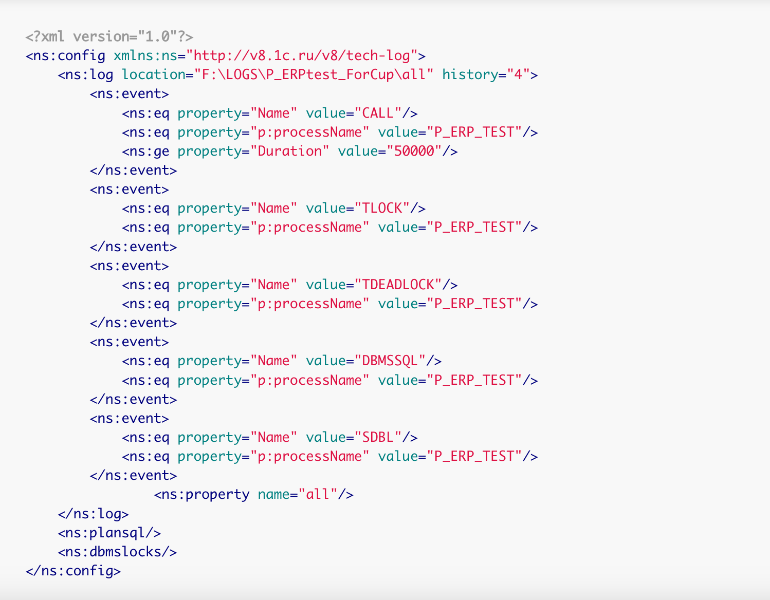 Перед демонстрацией включим сбор ТЖ. Пример конфигурационного файла logcfg.xml представлен ниже. Более подробно о настройках сбора ТЖ рассказано в предыдущей статье.
