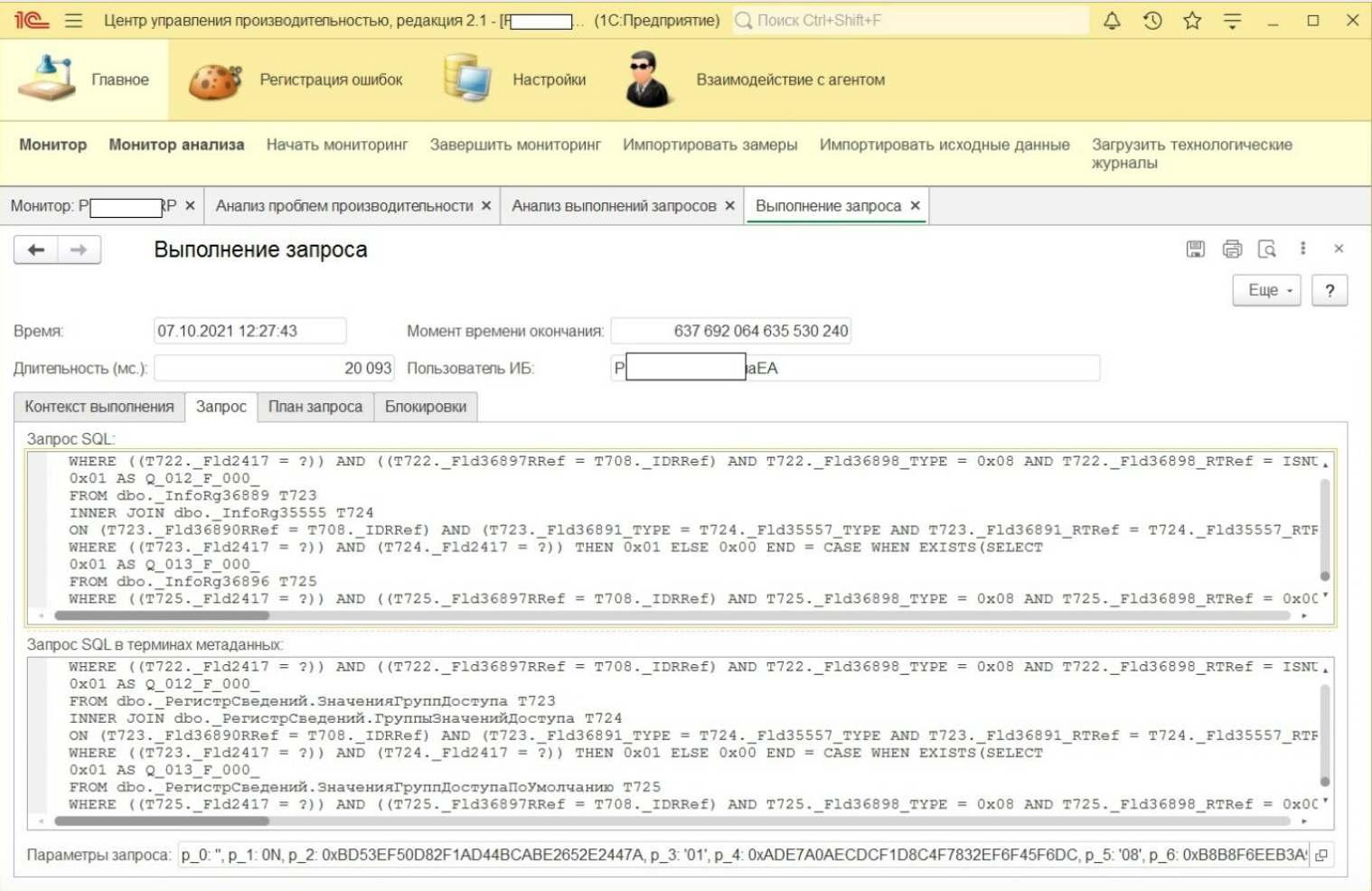 На второй закладке отображается запрос SQL, а также запрос SQL в терминах метаданных 1С. Можно увидеть, как преобразовался исходный запрос 1С в запрос SQL. В нашем случае добавилось огромное количество соединений к метаданным, отвечающих за RLS (ограничение прав на уровне записей).