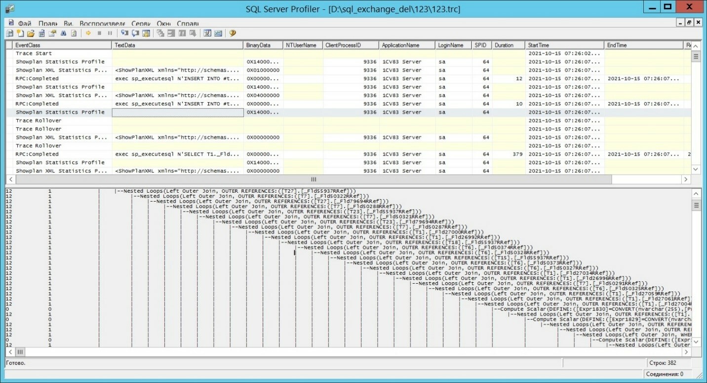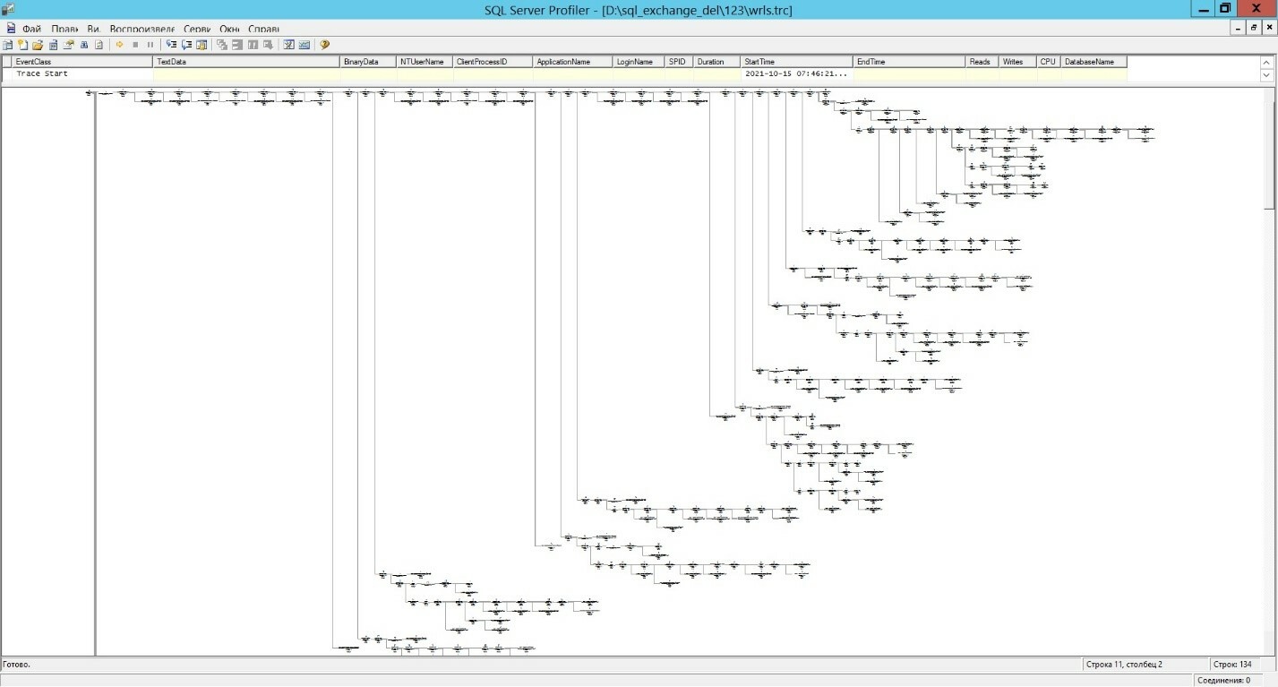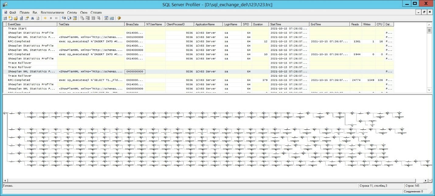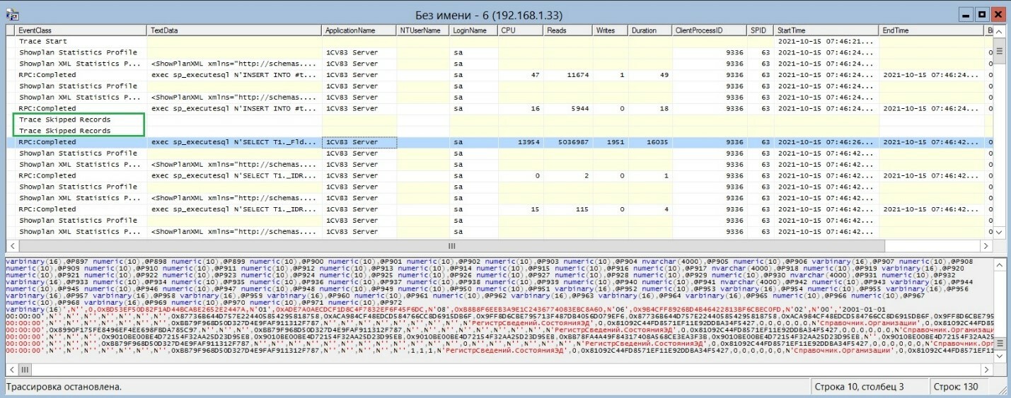 На экране мы видим собранные данные, но по самому тяжелому запросу вместо плана выполнения запроса выводится Trace skipped Records. Это происходит, когда на сбор данных требуются значительные ресурсы SQL Server. Поэтому мы сохраняли трассировку в файл.