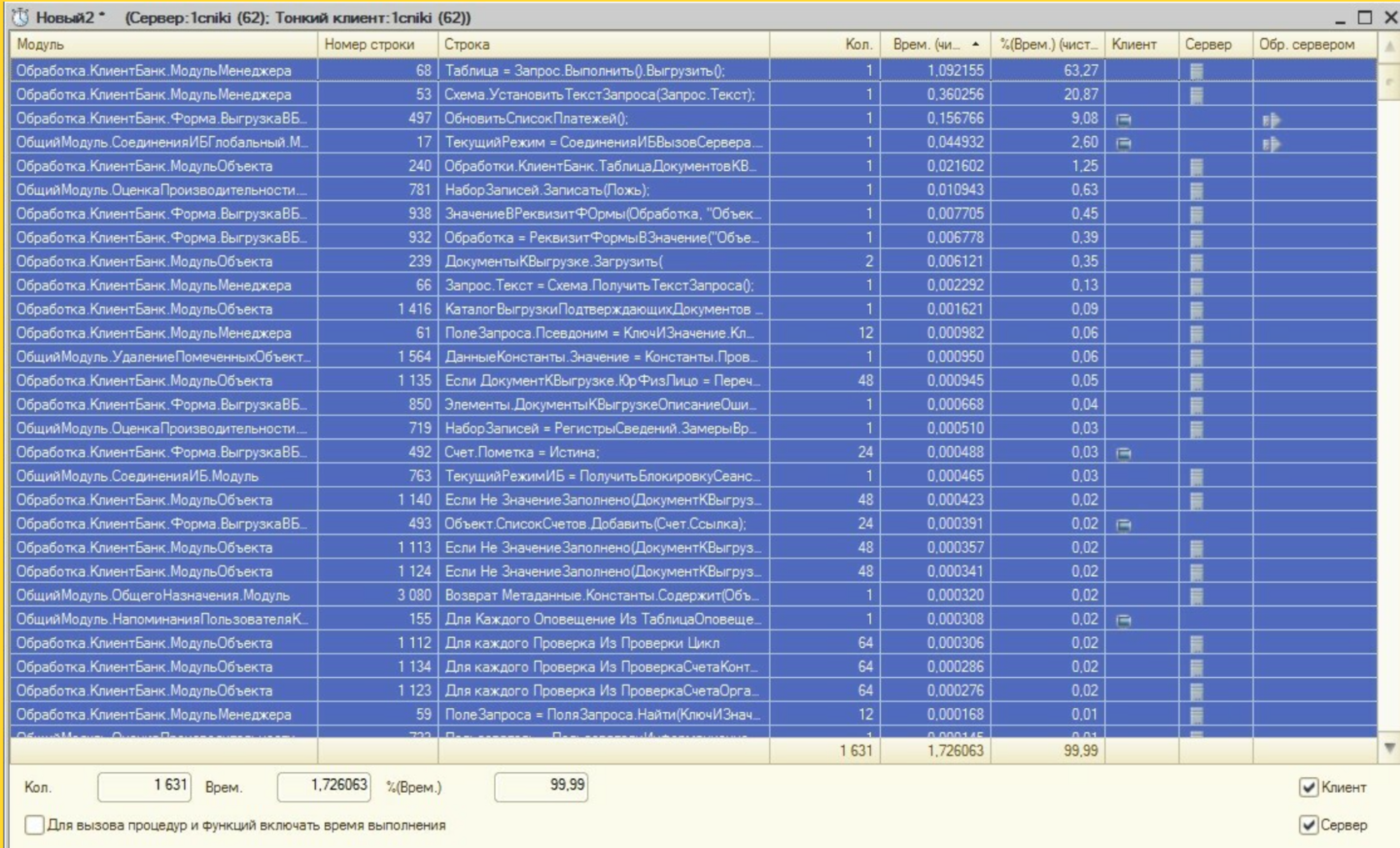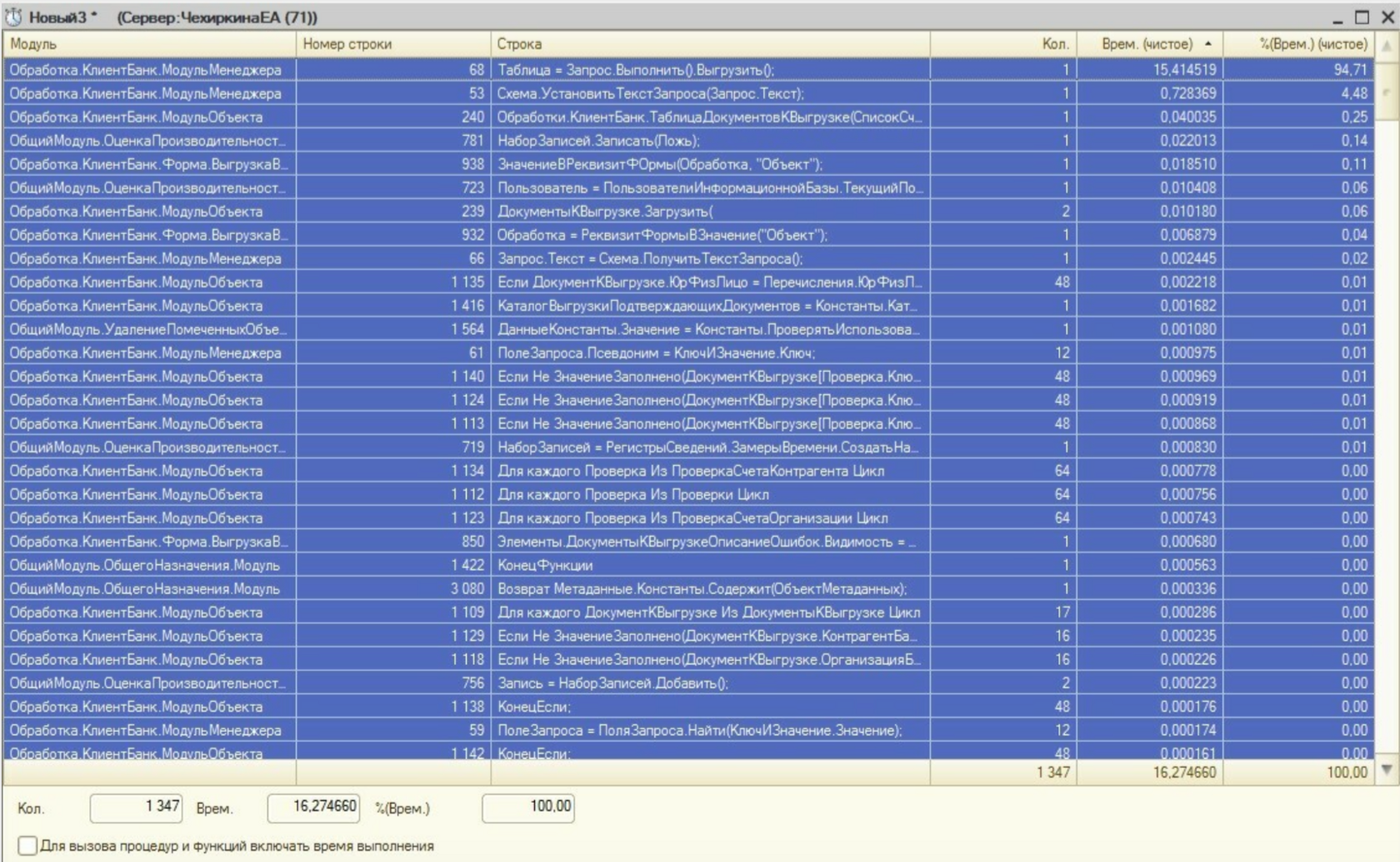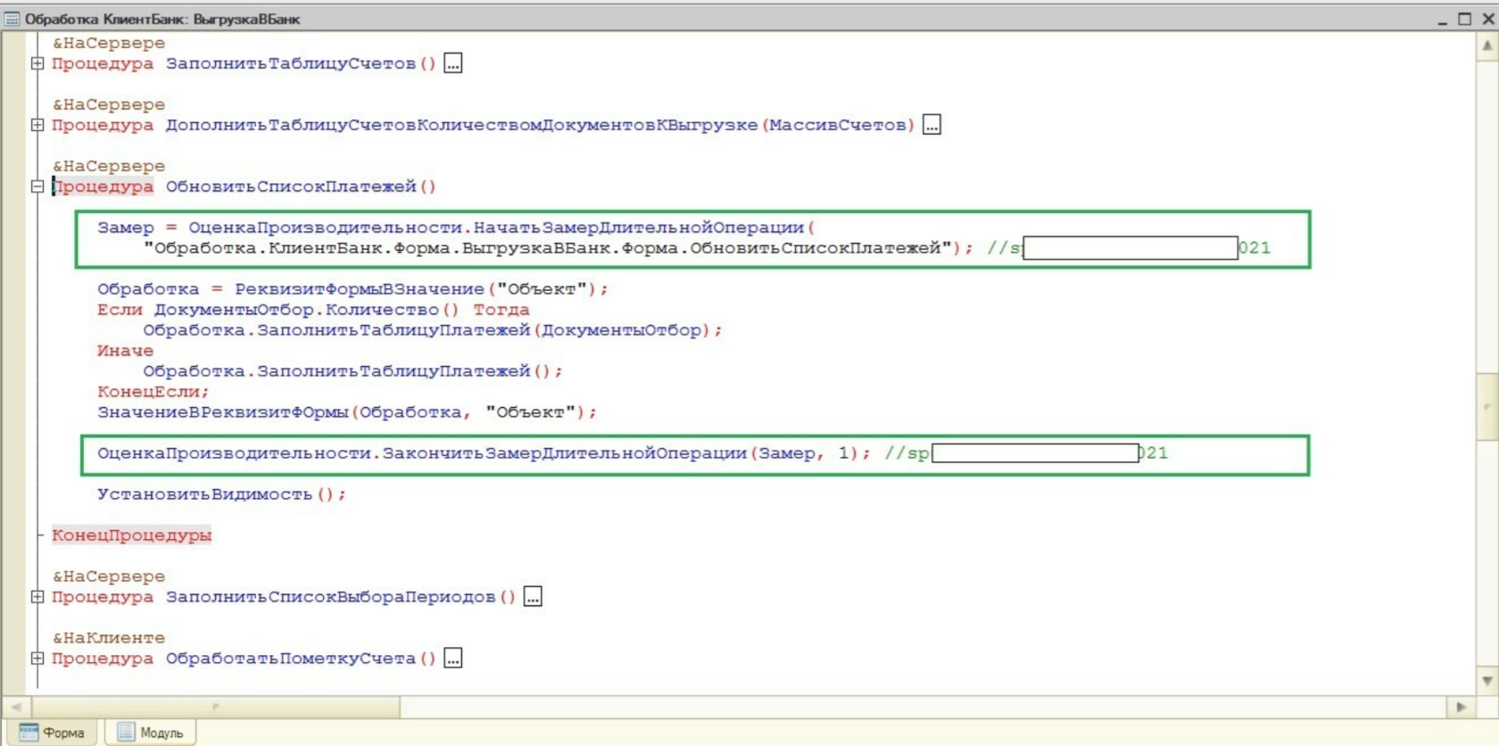 Оказалось, что данная ключевая операция не записывается в регистр «Замеры времени». Добавим необходимые строки кода для записи времени. Это необходимо для сбора статистики до и после оптимизации КО.