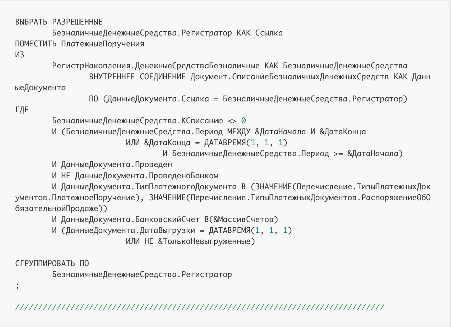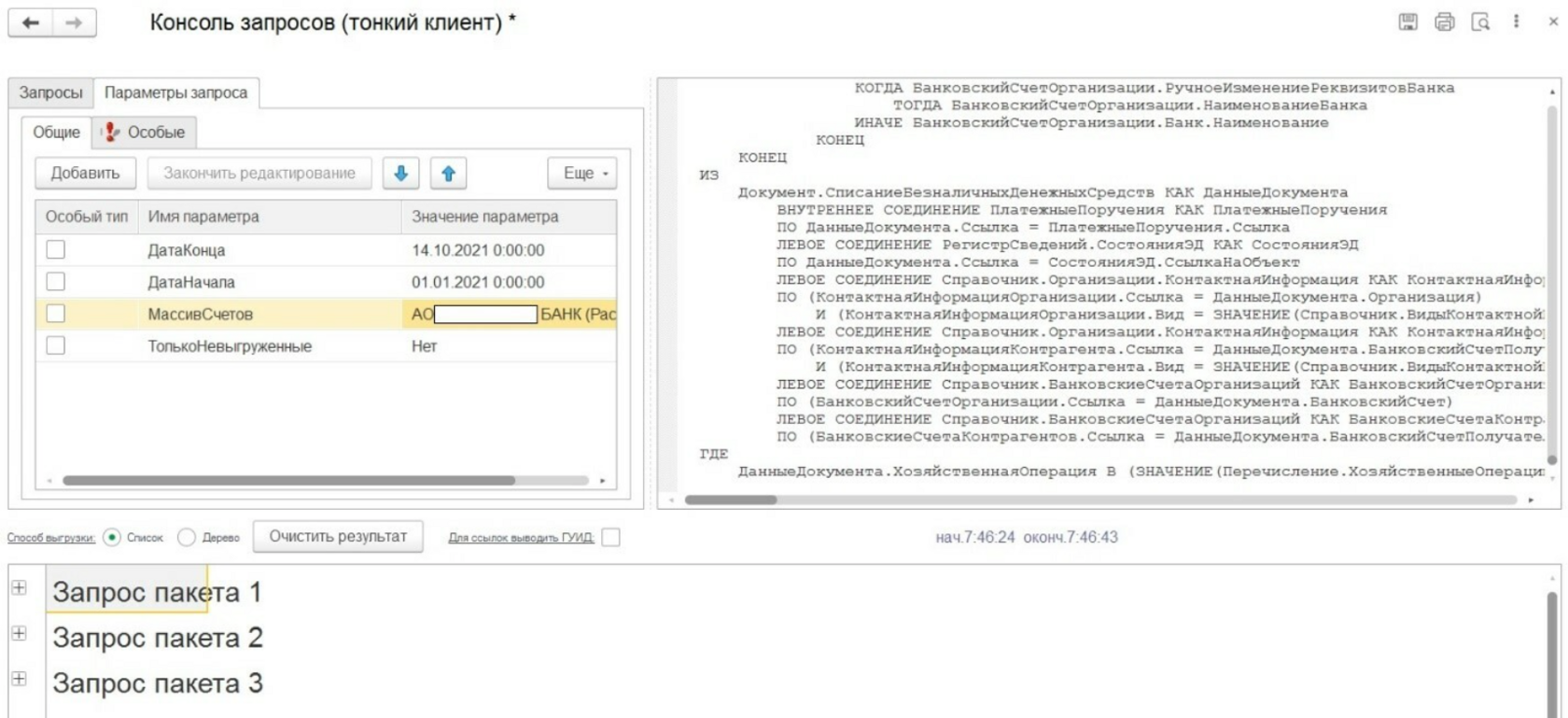 В консоли запросов необходимо заполнить параметры (их не так много) и выполнить запрос для проверки. Список документов выводится и совпадает с формой выгрузки платежей в банк. Оставим консоль открытой.