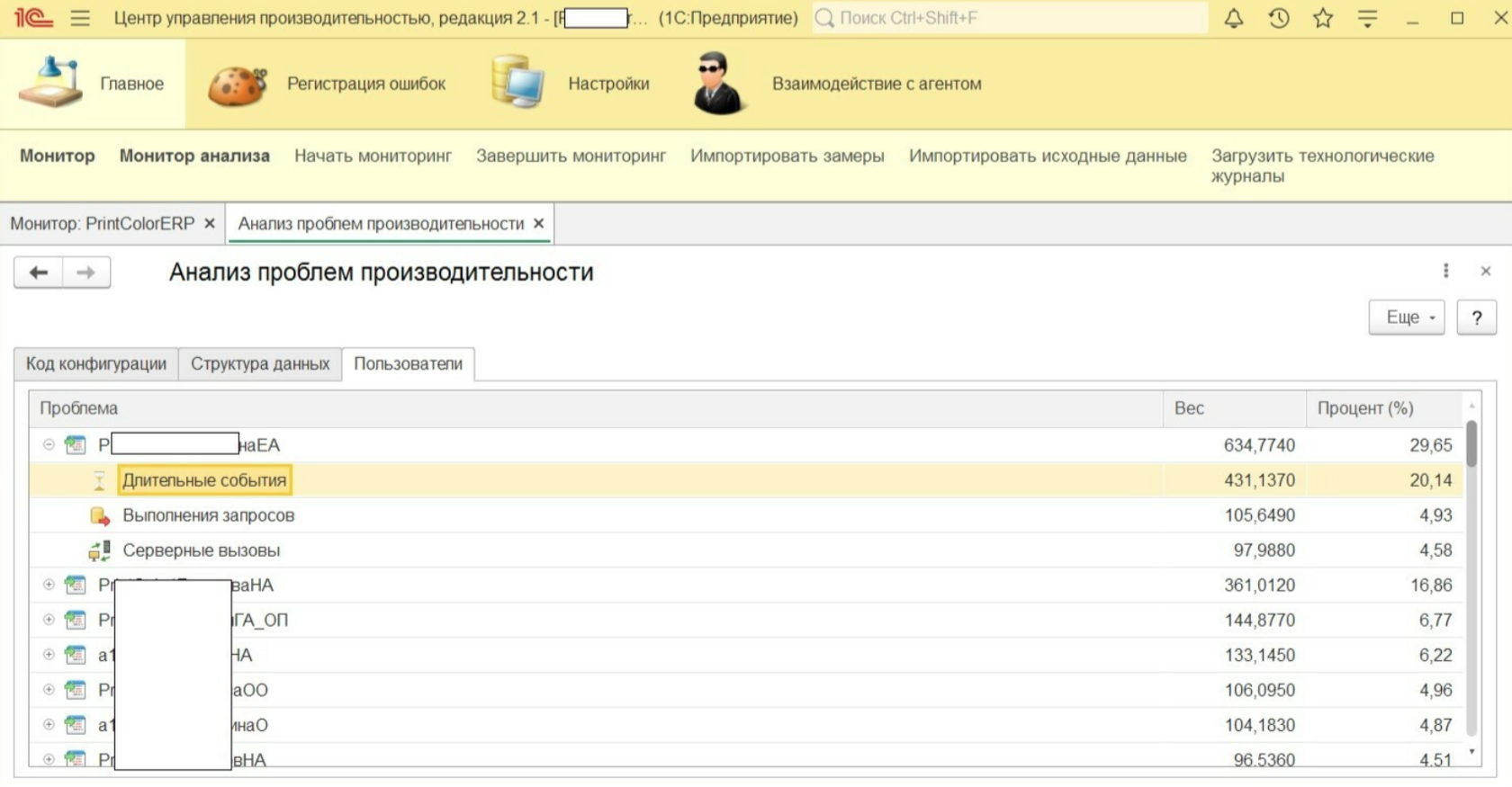 В предыдущей статье мы рассматривали, как можно собрать информацию по медленным операциям с помощью ТЖ. Например, по собранным данным в ЦУП можно увидеть проблемы производительности в разрезе пользователей. Затем можно связаться с пользователями и уточнить, есть ли жалобы на скорость работы и какие конкретно операции работают медленно.
