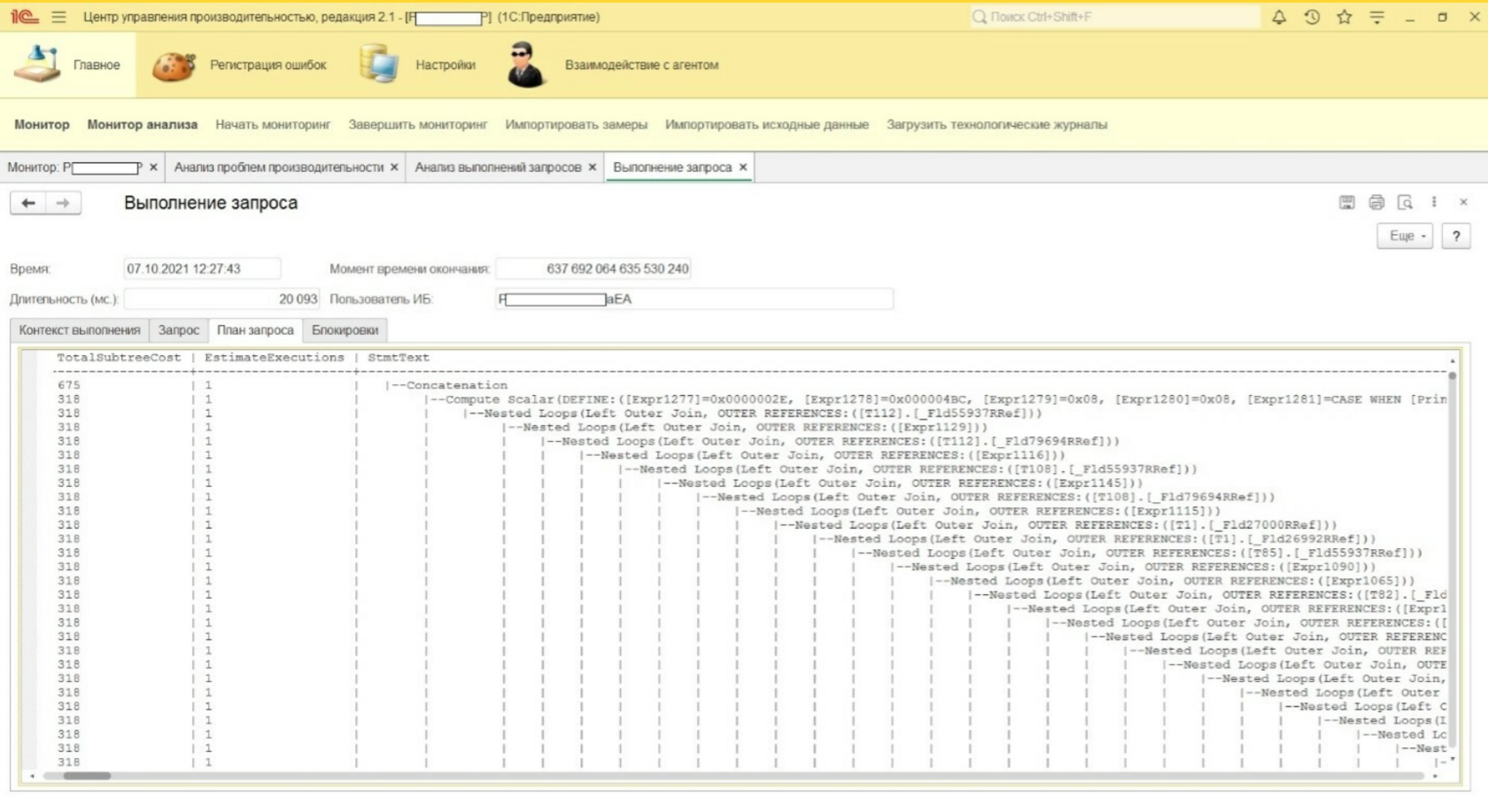 Открыв сохраненные данные можно просмотреть собранные планы выполнения запроса в текстовом и графическом виде. Текстовое представление аналогично тому, что мы видели в ЦУП.