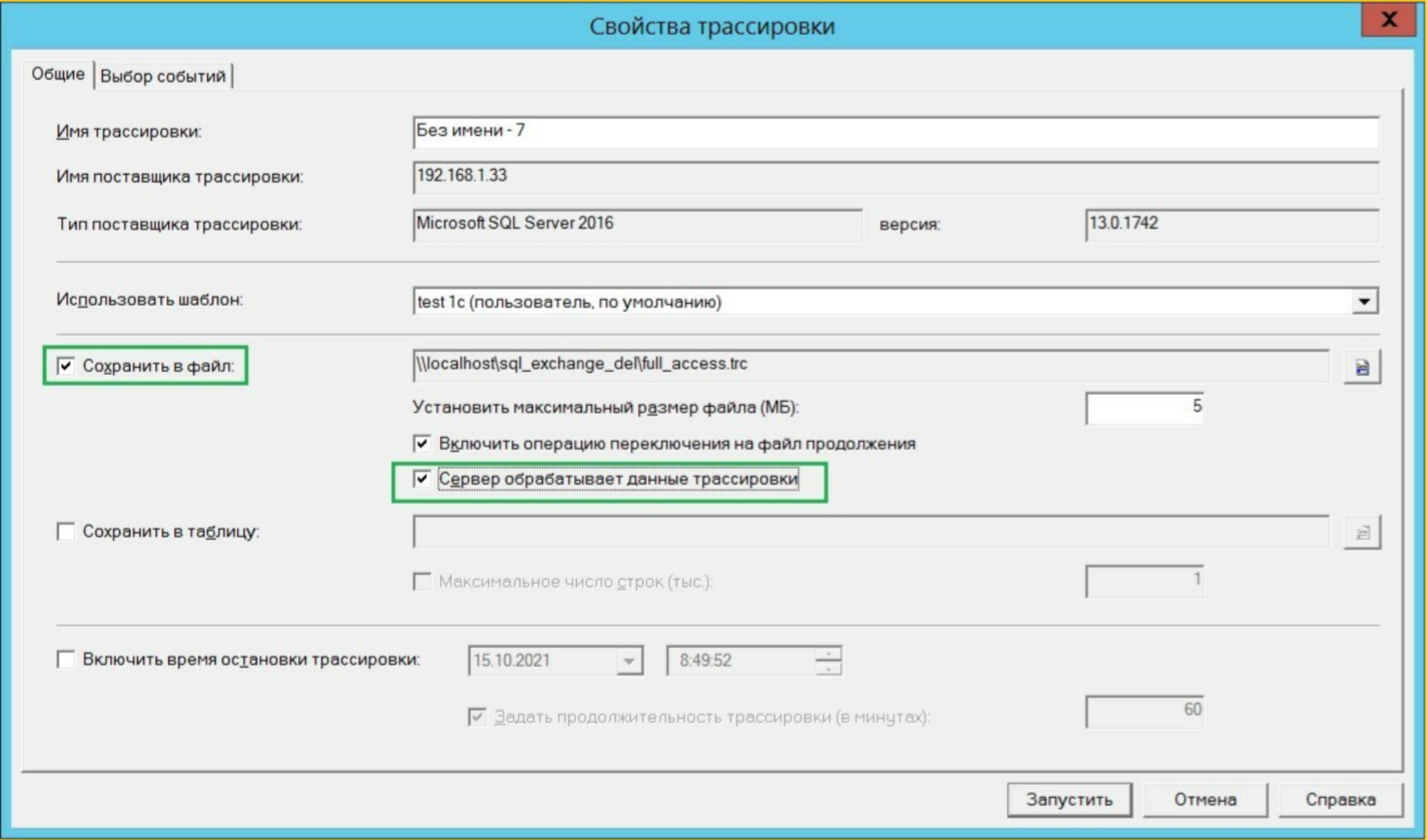 Для получения графического представления плана выполнения запроса выполним трассировку запроса средствами SQL Server Profiler. После подключения к SQL серверу запустим новую трассировку. В общих свойствах необходимо установить флаг «Сохранить в файл» и «Сервер обрабатывает данные трассировки». Это необходимо для сохранения объемного плана запроса, на сбор которого требуются значительные ресурсы.