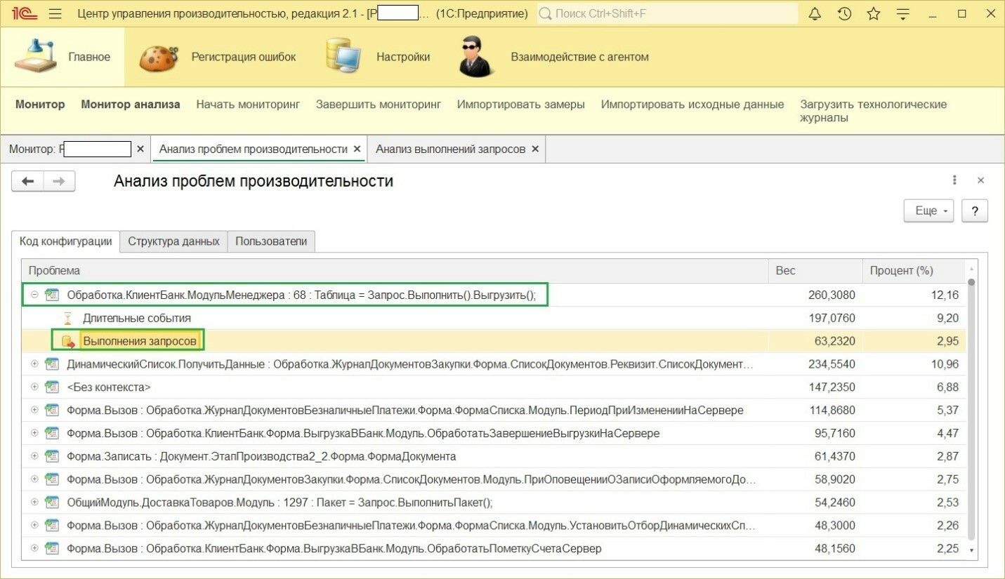 Загрузим ТЖ, собранный во время демонстрации, в ЦУП и выполним анализ производительности. в предыдущей статье подробнее описано, как это делать. Остановимся на результатах. В форме анализа проблем производительности видим на первом месте строку, знакомую нам по результатам замера конфигуратором: