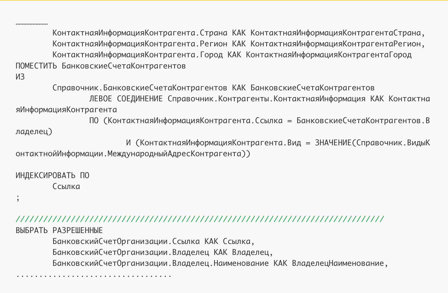 В форме выполнения запроса на первой закладке отображается контекст выполнения. Он будет полезен нам для определения, где ставить точку останова в конфигураторе, чтобы получить исходный текст запроса.