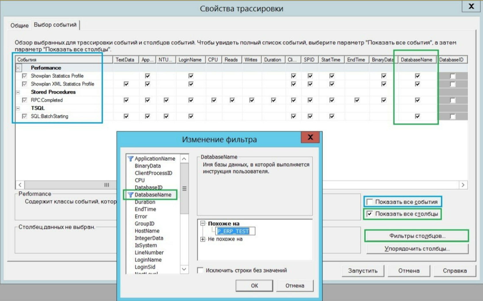 Также необходимо добавить столбец DatabaseName, чтобы была возможность установить фильтр на имя базы данных.