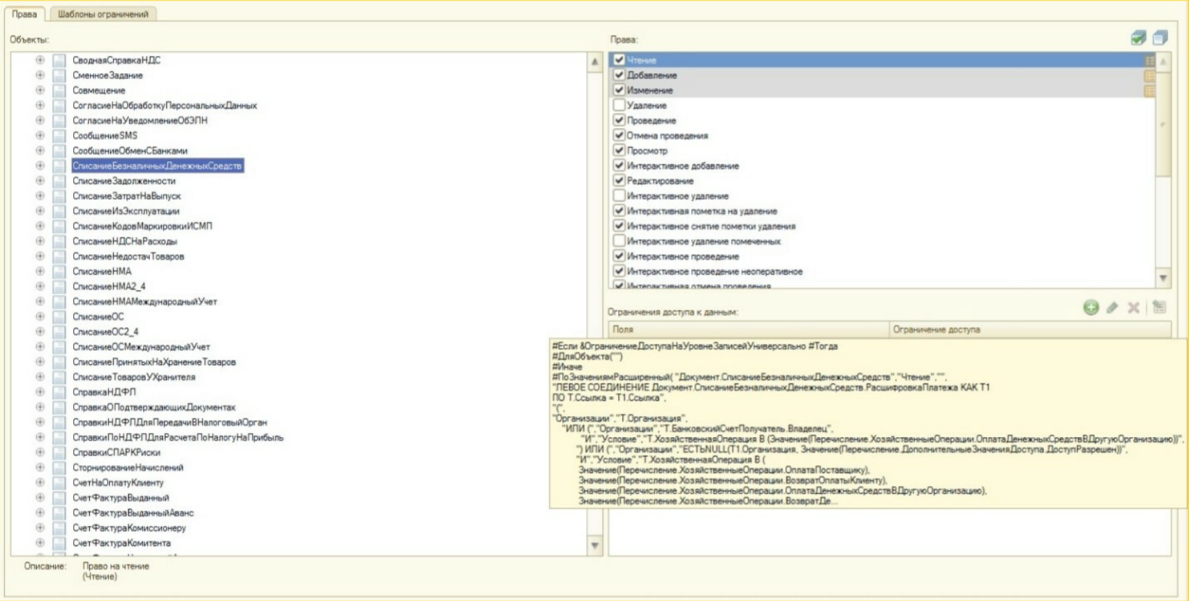 Мы выяснили, что при заполнении списка документов в форме выгрузки платежей в банк большая часть времени тратится на выполнение запроса. Произвели анализ запроса и сделали выводы, что план выполнения запроса, формируемый под ограниченными правами, построен неоптимально.